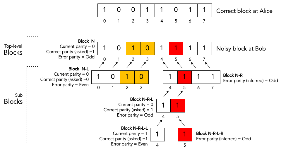 But look! Because of the ripple effect on the previous iteration N, we now have two blocks in iteration N that now have an odd number of errors! Bob can go back to those iteration N blocks and re-apply the Binary protocol to correct one more error in them.