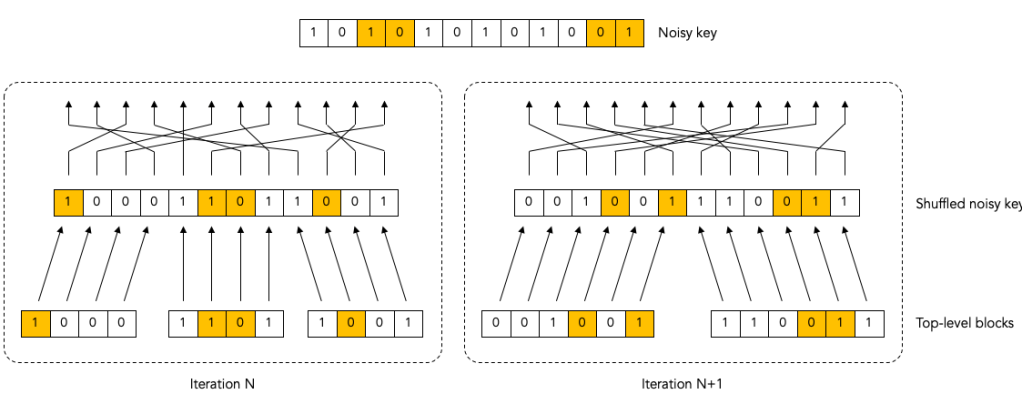 But wait! If are going to be flipping bits (correcting errors) on de underlying unshuffled noisy key, then this is going to have a ripple effect on the shuffled blocks from earlier iterations.