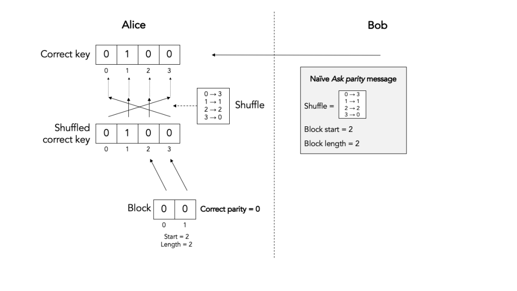 It is even okay if Eve knows what the shuffling permutation is (shown as the “Shuffle” in the above diagram) as long as the actual key values before (“Key”) or after the shuffling (“Shuffled key”) are not divulged. In fact, Bob needs to inform Alice what the shuffle permutation for each Cascade iteration is. It is no problem if the information about the shuffle permutation is sent in the clear and Eve can observe it.