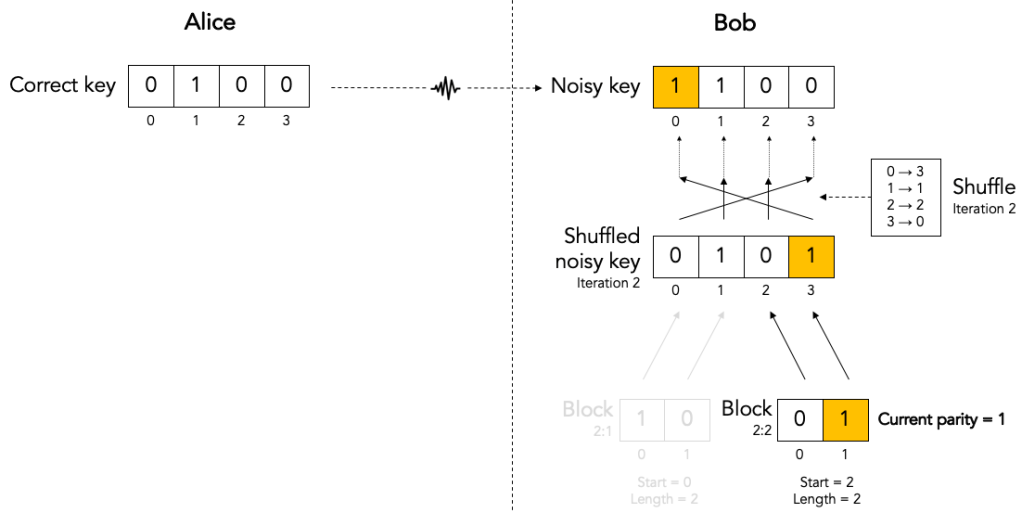 Let’s say that Alice and Bob are the two parties that have just run the quantum phase of a quantum key distribution such as BB84. Alice has the correct key and Bob has a noisy key, which is similar to Alice’s correct key but which has some limited number of bit errors (i.e. noise). Alice and Bob will now run the Cascade protocol to detect and correct any remaining bit errors in the Bob’s noisy key.