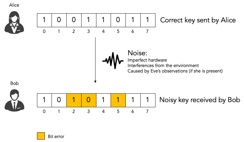 As we described earlier, the quantum key distribution protocol introduces some noise when it delivers this key to Bob. Thus, Bob has a noisy key which has some bit errors compared to Alice’s correct key.