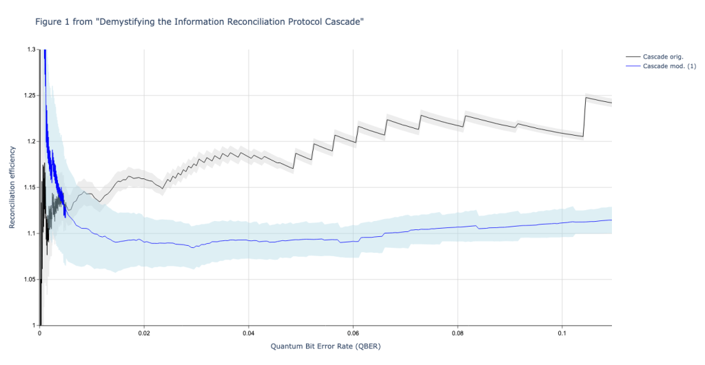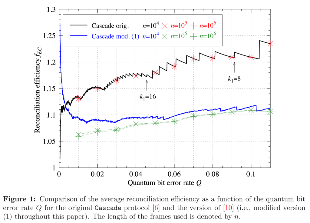 For the standard Cascade protocol we get an efficiency of about 1.2, and for the modified Cascade protocol we get an efficiency of about 1.1. Both are considered to be very good. In other words, relatively little information (about 20% and 10% respectively) is leaked.