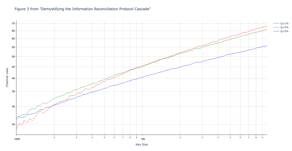 For example, the following graphs show the number of channel uses in Cascade protocol as a function of frame length (key size) for three different error rates. Again, the first graph is computed by our C++ implementation and the second graph is reported in literature.