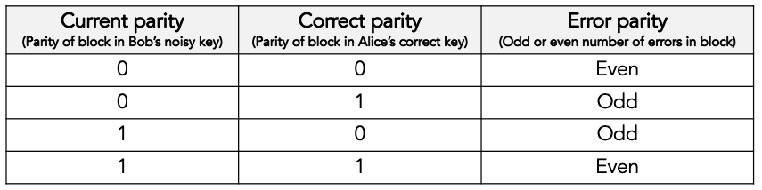 Thus, we can see that for every exposed parity bit, the effective usable key length is reduced by one bit. The privacy amplification step, which takes part after the Cascade information reconciliation step in classical post-processing, takes care of reducing the key length and erasing any information that was exposed by the parity bits in the Cascade protocol.