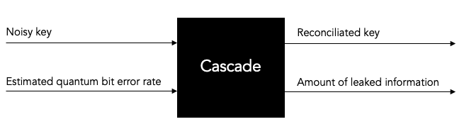 Thus, we have two inputs to the Cascade protocol: the noisy key and the estimated quantum bit error rate (QBER).