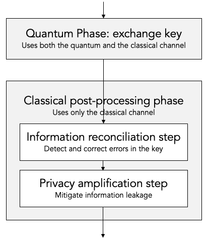 - Information reconciliation, which is responsible for detecting and correcting inevitable bit errors (noise) in the key that was exchanged during the quantum phase.