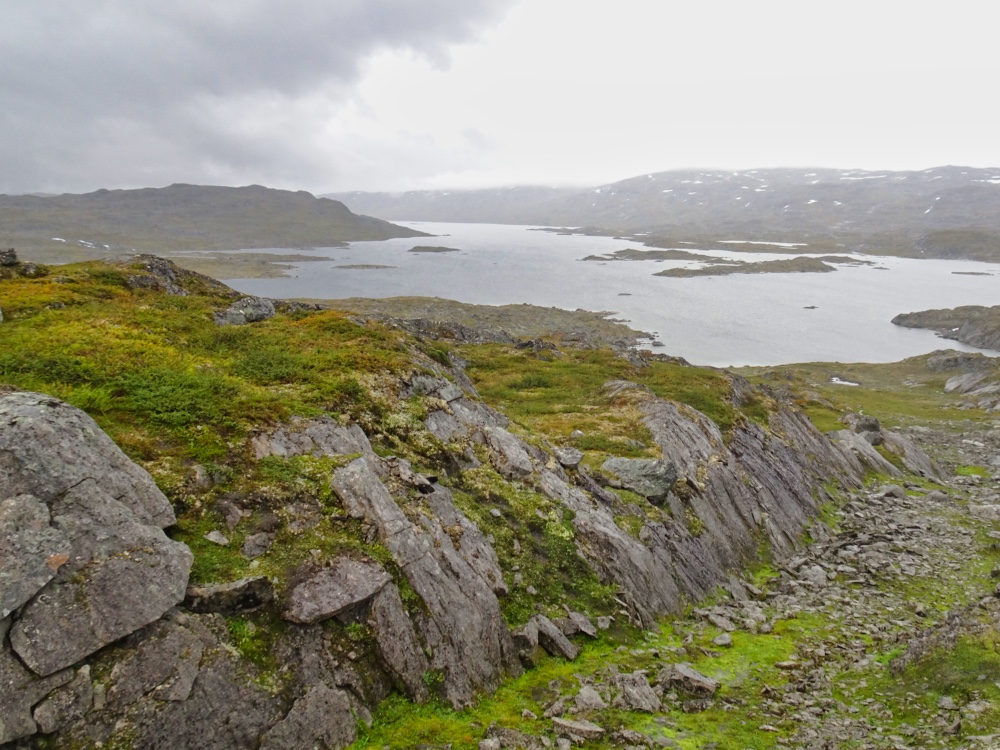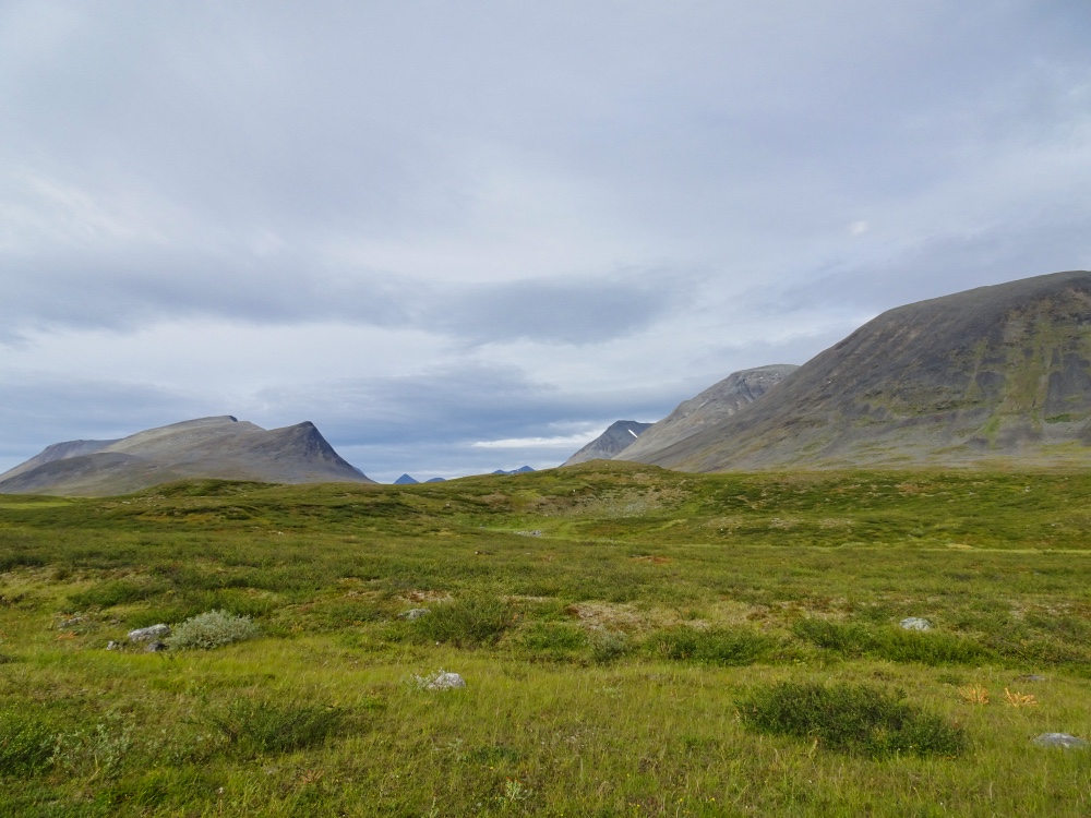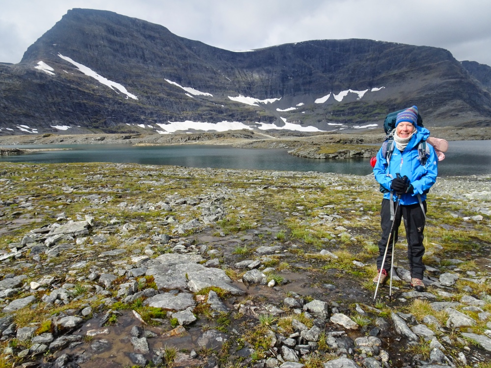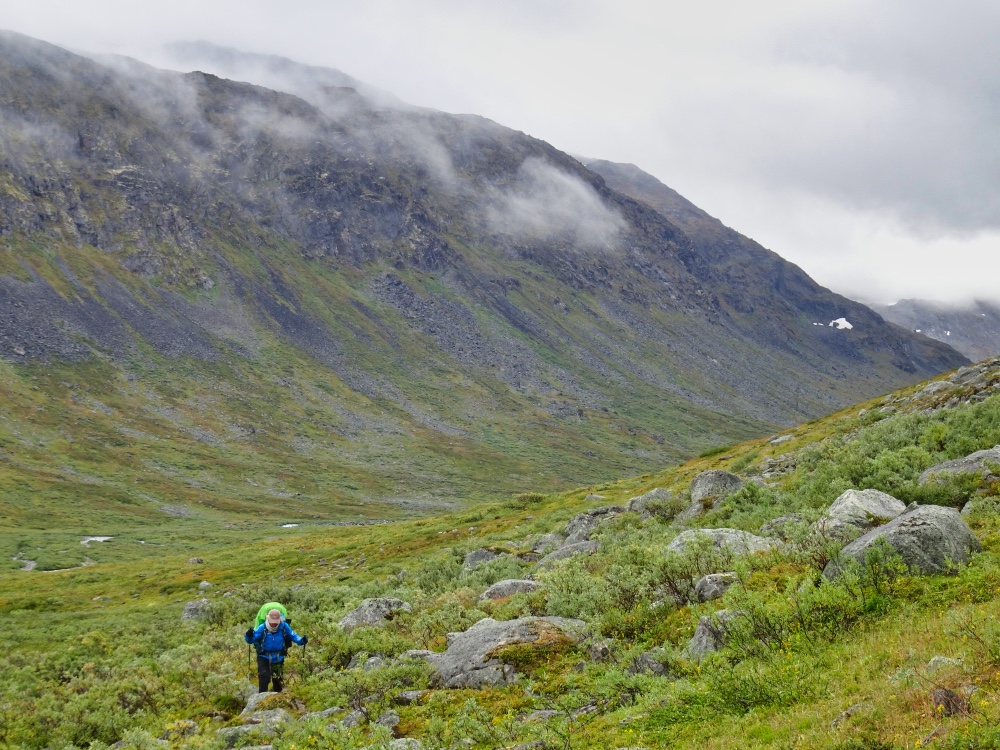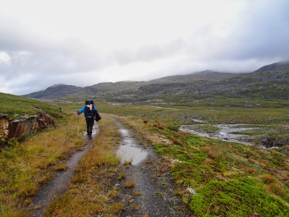 We woke up to rain so we donned our rain gear and took off. We had to take extra care with the rocks and stones since they have become slippery with the rain. Unfortunately, Tecla’s feet had started to develop an injury from the heavy pack and the long days, and the terrain was definitely not improving it. After what felt like an eternity we reached the Gautelishytta where we enjoyed a fire and some soup. At Gautelishytta we made the decision to head north towards Katterat instead of continuing south towards Ritsem (which was our original destination) on the Nordkalottleden. There were a few factors that made us decide that. One: we had recently learned that we would arrive at Vaisaluokta too late for the last scheduled boat or helicopter to Ritsem (both stop on 4 September). Two: We had planned to solve this problem by hiking the Gränsleden trail from Røsvatnhytta to Ritsem, but the STF in Ritsem had warned us that some sections of the Gränsleden trail were flooded with one meter of water. Also, the hut logbook in Gautelishytta contained recent entries describing unusual high water levels and flooding after Røsvatnhytta. There is a 50 km section without any huts or shelters, and we did not relish the thought of doing that in deep mud. The third and final straw was that Tecla’s foot injury was worsening. The trail north towards Katterat consisted of short 12 km sections whereas the trail south to Ritsem had long 25+ km sections. The cherry on the cake was that we had heard that the section from Gautelishytta to Katterat through the Narvik mountains was very beautiful (which, indeed, it was).