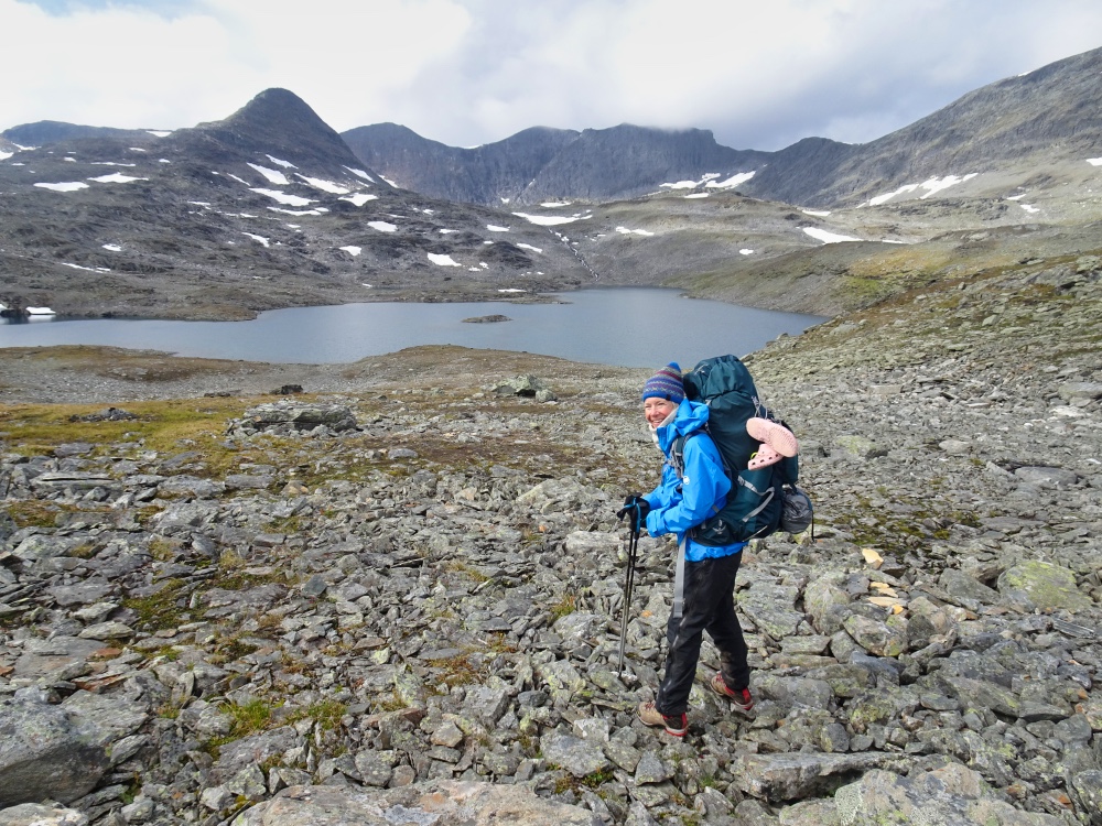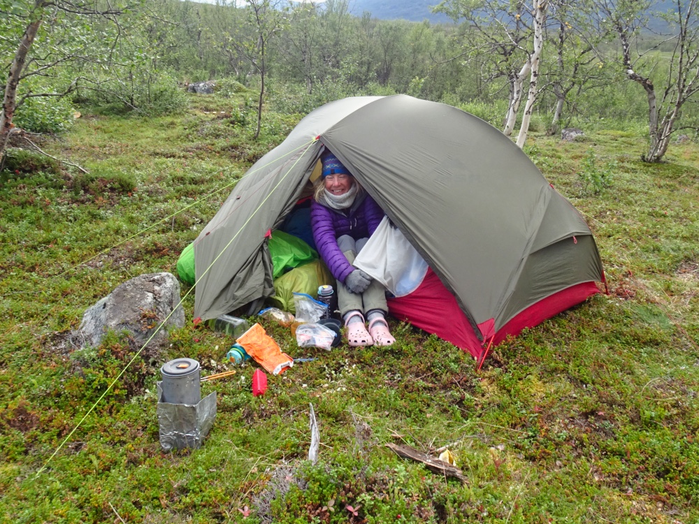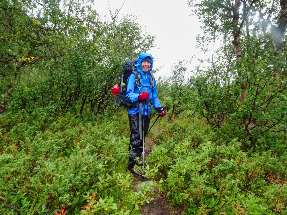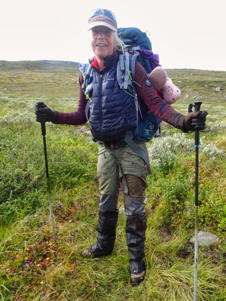 The day started out sunny but heavy rain was in the forecast. We left Daertahytta early, hoping that we could make quite some kilometers before the rain would start. In itself this was an easy section and just as most other sections, gorgeous, but very muddy. A word of advice: when trying to find your way through the swamps, use your pole and don’t lean on it until you know the depth of the mud pools. Tecla sank waist deep into the mud and there are quite a few entries in the hut logbook from people who met the same fate 😯. Once we reached the high plateau, the rain caught up with us, but luckily we still had visibility and could still admire the beautiful surroundings and a rainbow close to Dividalshytta.