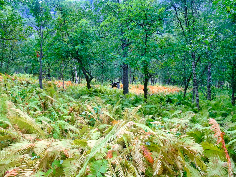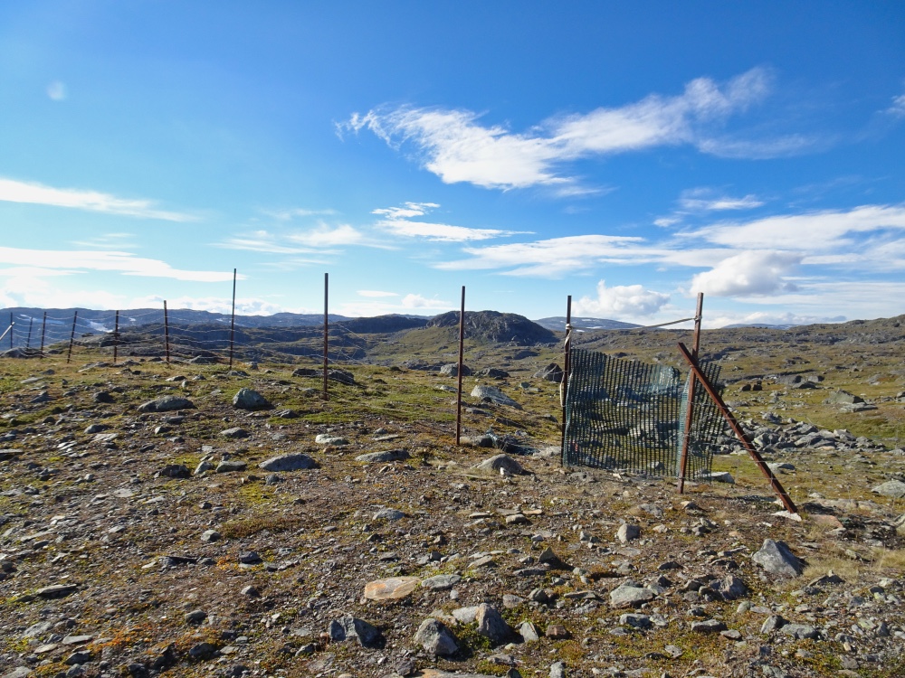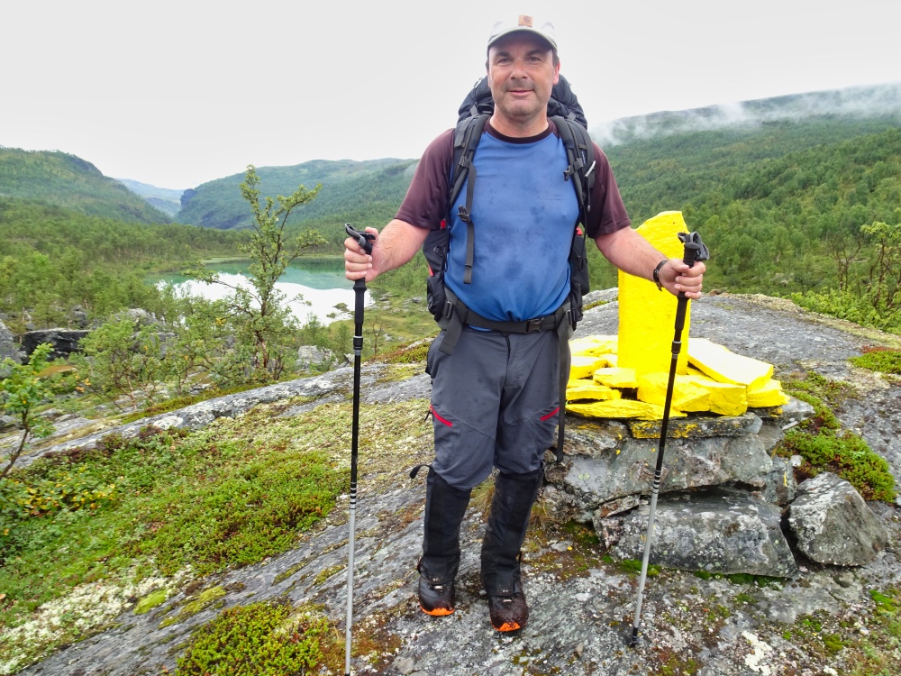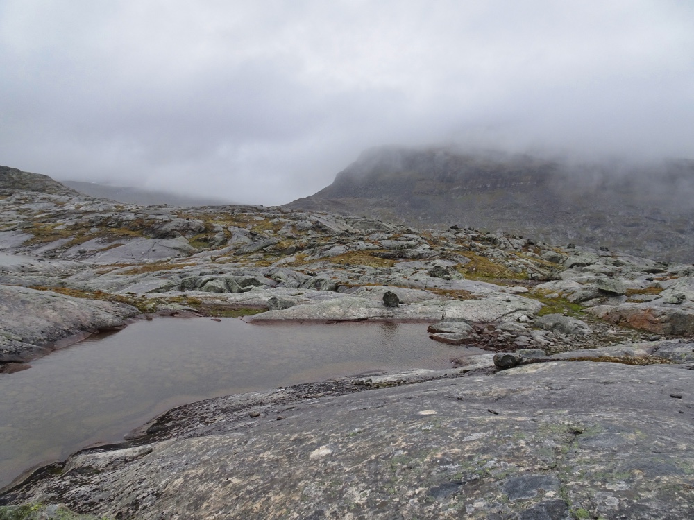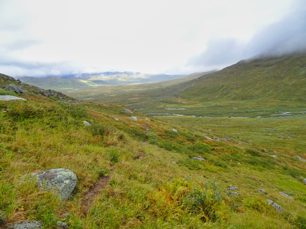The day started out sunny but heavy rain was in the forecast. We left Daertahytta early, hoping that we could make quite some kilometers before the rain would start. In itself this was an easy section and just as most other sections, gorgeous, but very muddy. A word of advice: when trying to find your way through the swamps, use your pole and don’t lean on it until you know the depth of the mud pools. Tecla sank waist deep into the mud and there are quite a few entries in the hut logbook from people who met the same fate 😯. Once we reached the high plateau, the rain caught up with us, but luckily we still had visibility and could still admire the beautiful surroundings and a rainbow close to Dividalshytta.