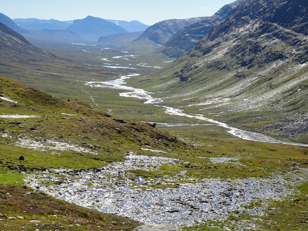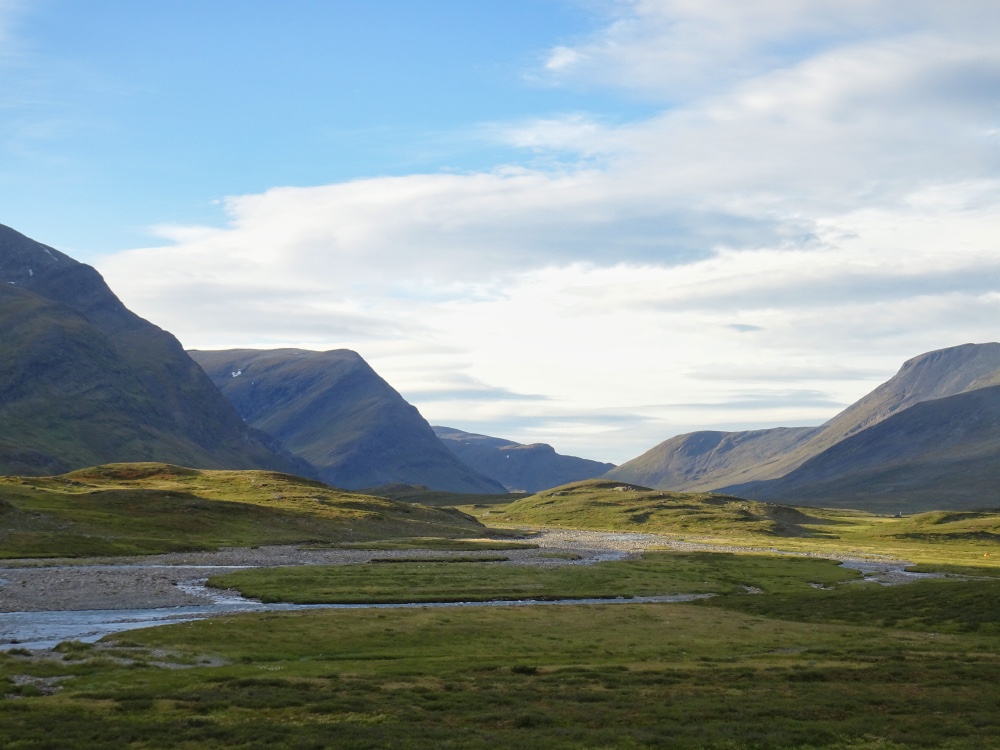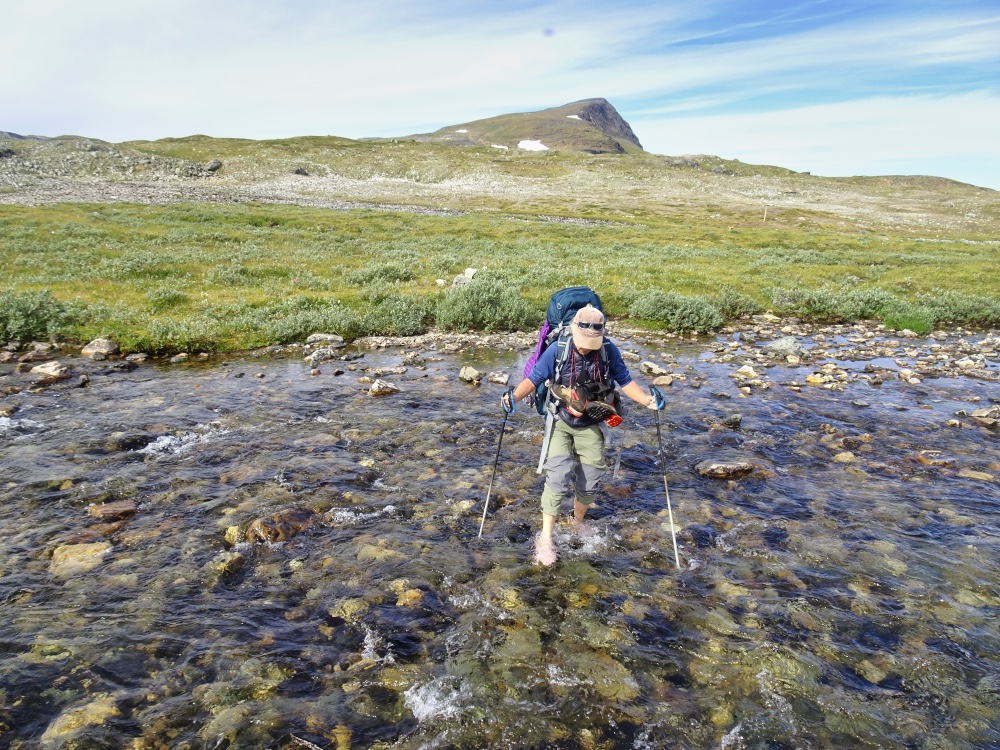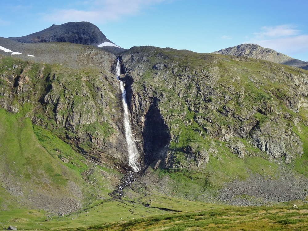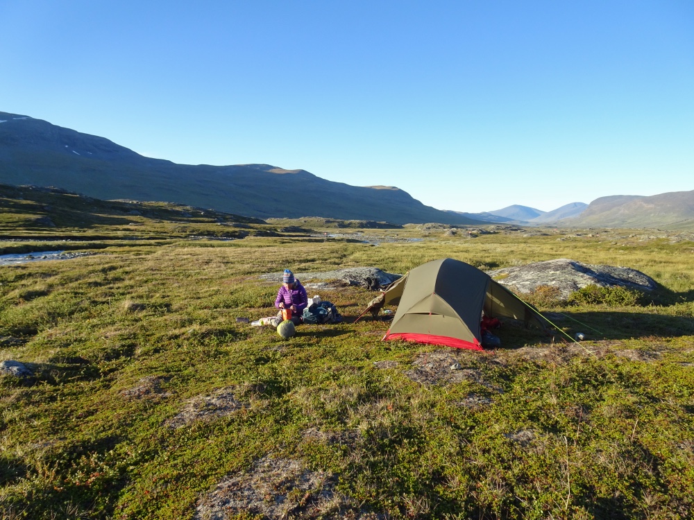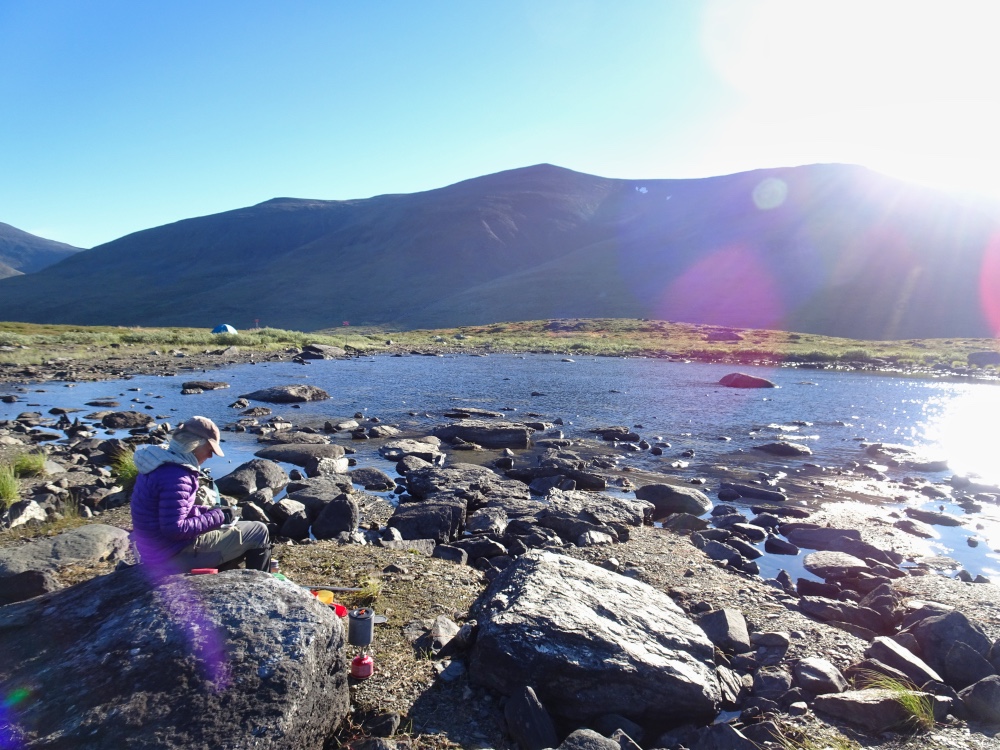 After a restful night we took off the next morning towards Rostahytta. We had two options here: the high route via Isdalen or the lower, easier route via Pältsa Fjällstuga. Since the weather looked promising, we choose the high route through Isdalen, the wilder and more beautiful option. There was no snow on the trail anymore (only some snow higher up on the mountains) and the views were stunning. Since we were hiking in August, the river crossings didn’t cause any problems although our Crocs did come in handy 😁. The weather cleared up completely and we decided to camp a couple of kilometers before the the hut next to a small lake and right below a huge waterfall.