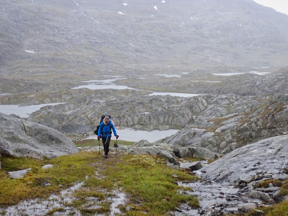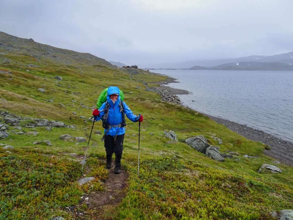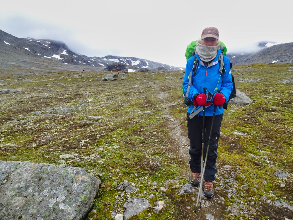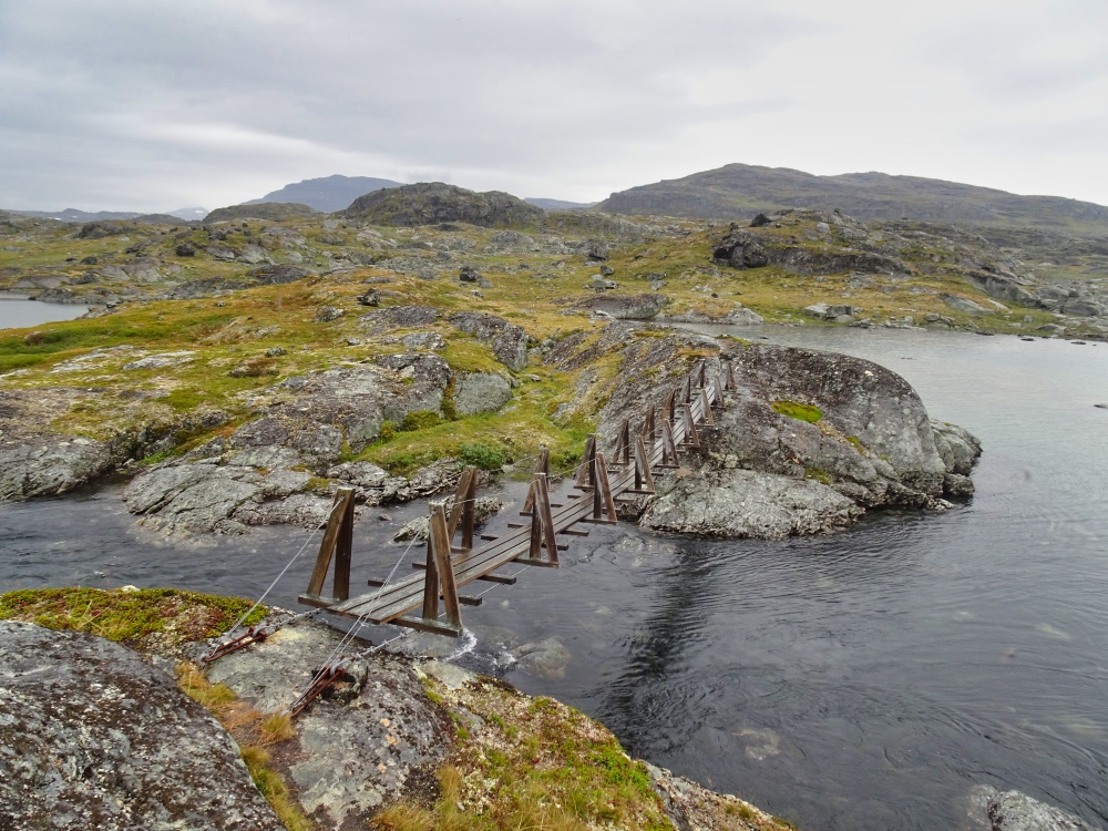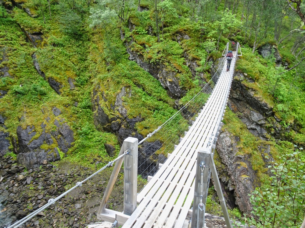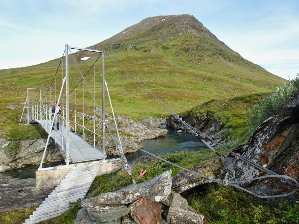There was rain in the afternoon weather forecast, so again an early start. The trail along the canyon was beautiful, flat, and easy with great views of the river and canyon. We very much enjoyed our “stroll” along the river. The ascent up to the high country at the end of the valley is quite steep in the beginning. After the initial climb you gradually ascend to an alpine plateau where the rain accompanied us. Tip: at a certain point there is a sign in Norwegian pointing you to a hanging bridge; follow the first sign you see. We didn’t, we followed the second sign and had to descend quite a bit to reach the bridge. Despite the rain the high plateau was still beautiful and we arrived in good spirits at the Lappjordhytta where we spent a wonderful evening with fellow hikers.
