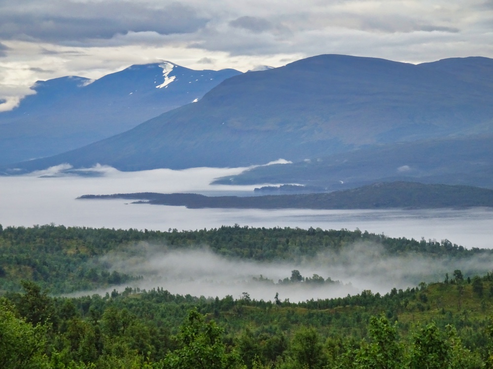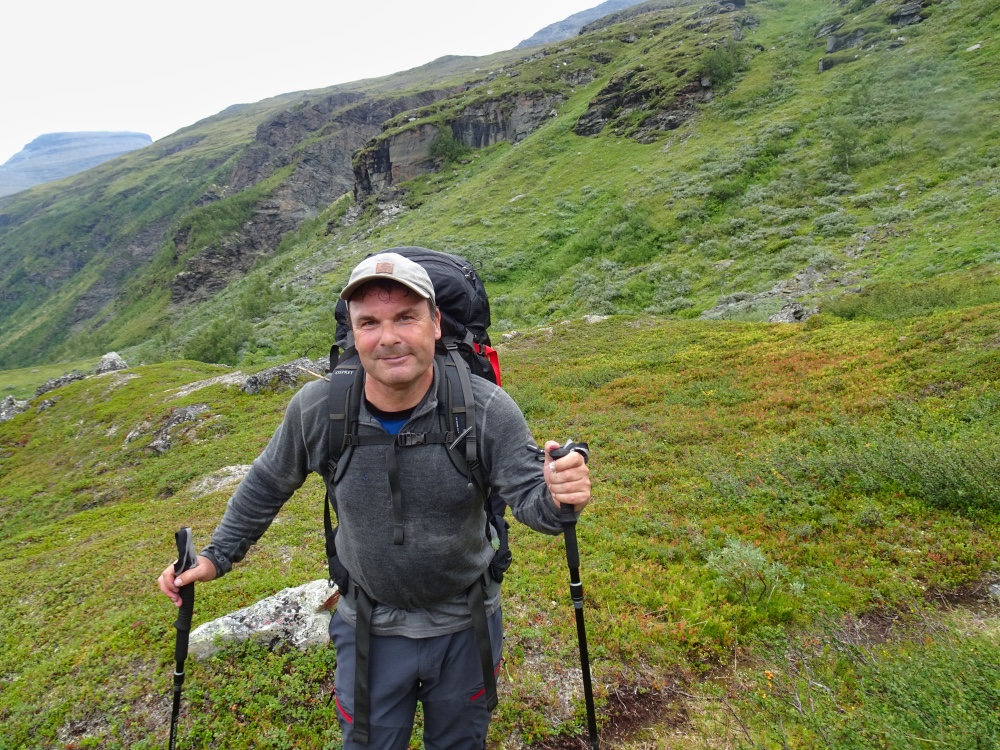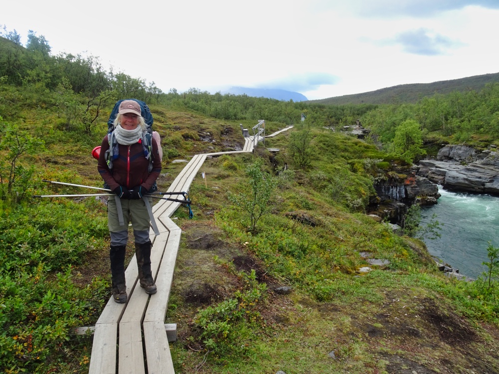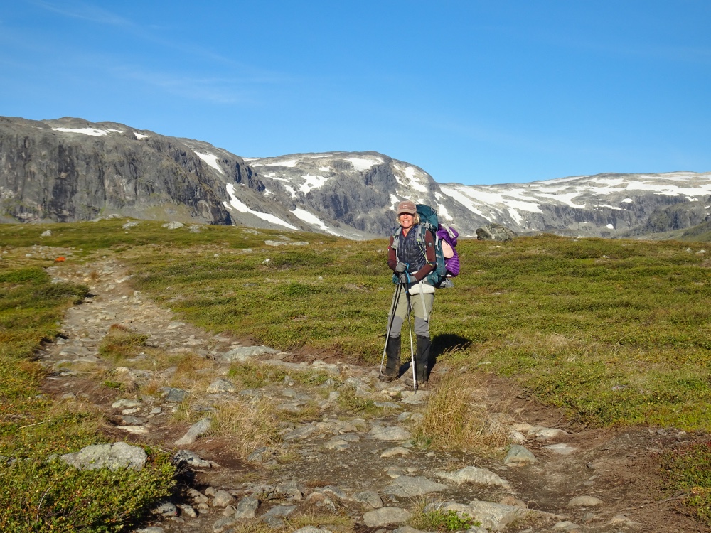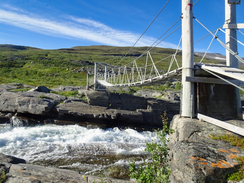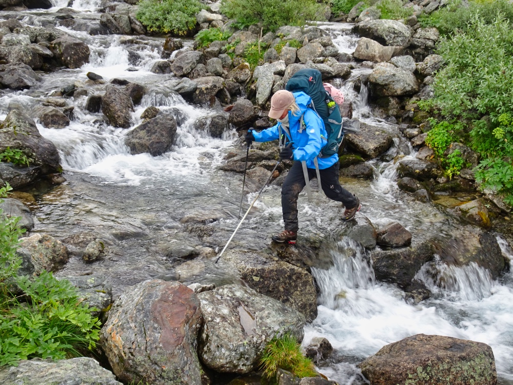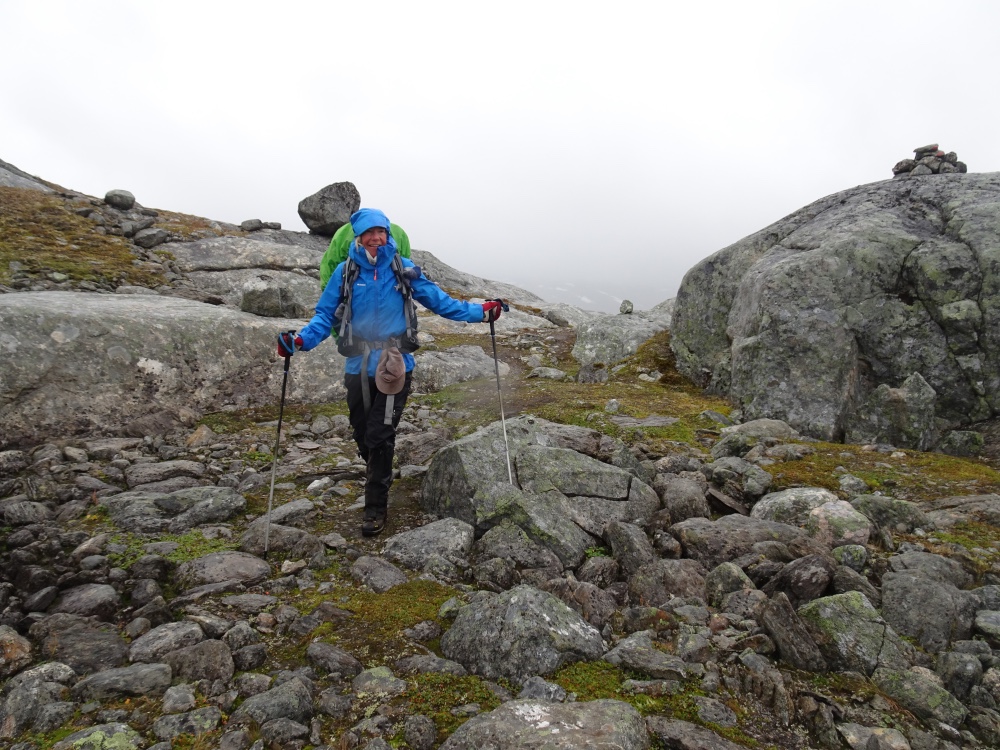 There was rain in the afternoon weather forecast, so again an early start. The trail along the canyon was beautiful, flat, and easy with great views of the river and canyon. We very much enjoyed our “stroll” along the river. The ascent up to the high country at the end of the valley is quite steep in the beginning. After the initial climb you gradually ascend to an alpine plateau where the rain accompanied us. Tip: at a certain point there is a sign in Norwegian pointing you to a hanging bridge; follow the first sign you see. We didn’t, we followed the second sign and had to descend quite a bit to reach the bridge. Despite the rain the high plateau was still beautiful and we arrived in good spirits at the Lappjordhytta where we spent a wonderful evening with fellow hikers.