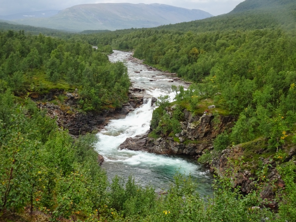The first part of the day was beautiful. We followed a trail on the edge of a large canyon with fantastic views of the wild river and waterfalls deep below. After we crossed the bridge over a side river it started to rain. Suddenly, the path, while still clear, was not marked with red dots anymore and became extremely muddy. It winded its way through birch forests and bushes. It was very time consuming to find our way. In retrospect, we think that we may not have followed the official path. We were always at least 200 meters from the river but some maps (e.g. AllTrails.com) trail much closer to the river. Maybe we missed a split. We did eventually end up back on the marked trail. Once we turned left to start the last climb up to the Vuomahytta, we left mud and trees behind us and entered beautiful alpine country again. At the very end, the sun even made an appearance to to accompany us for the last bit.