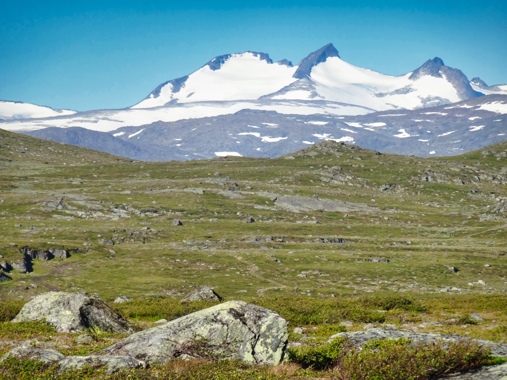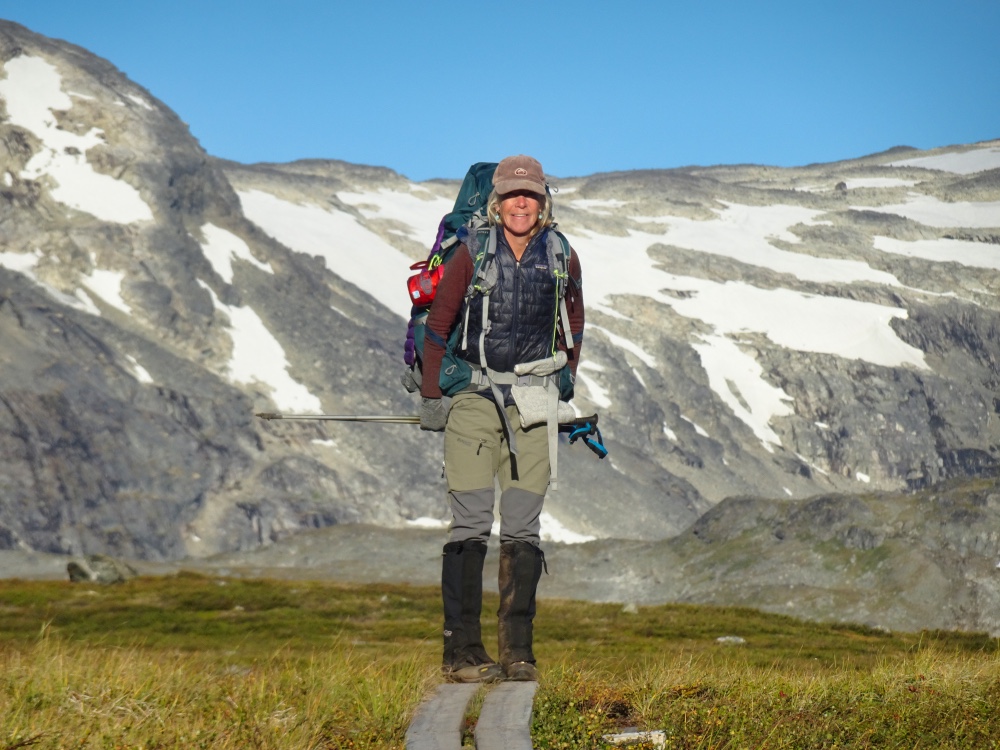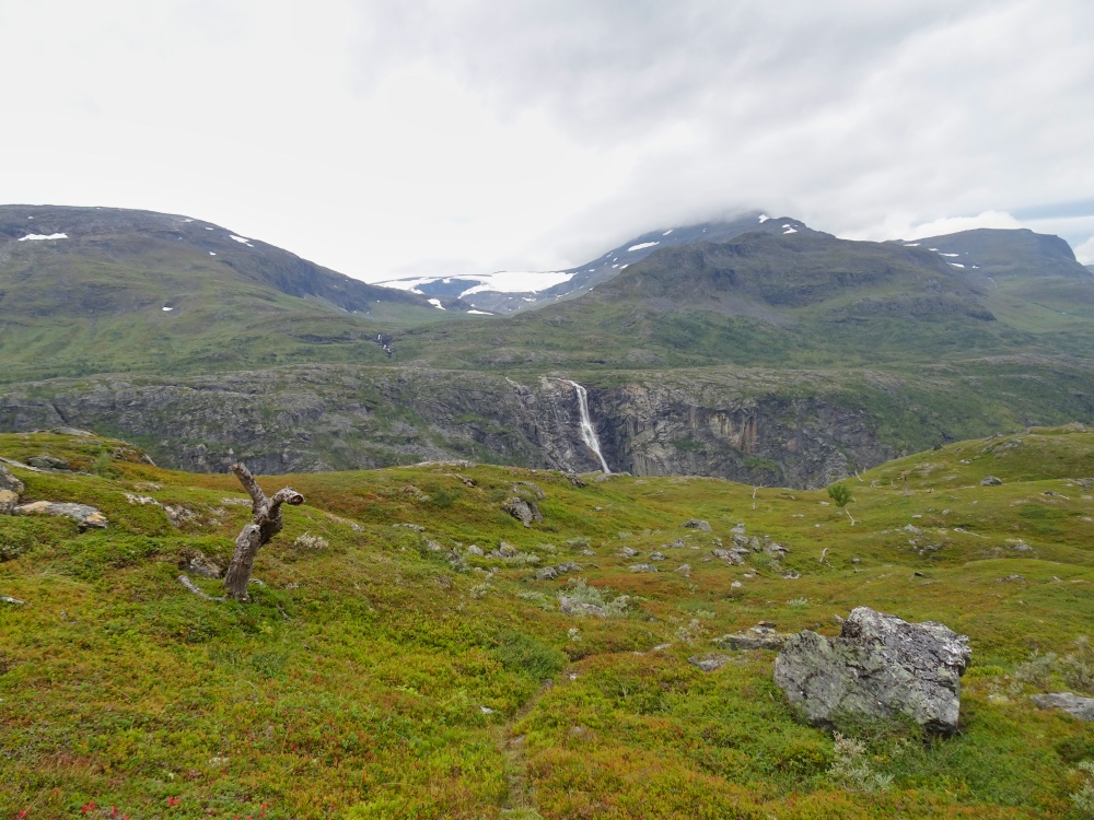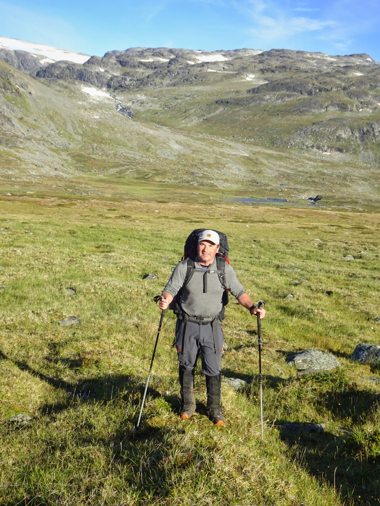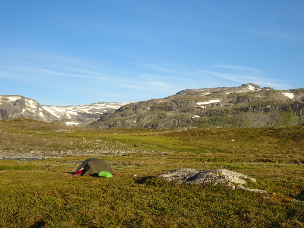 This section is marvelous high country. We took our time, enjoying the sun. The tundra was dotted with lakes and surrounded by mountains from which waterfalls came tumbling down. We arrived at the very cozy Gaskashytta with a bit of an issue: unfortunately Bruno’s Italian hiking boots could not withstand the Norwegian mountains and his sole came off. We didn’t think that a temporary fix with ducktape would do the trick, so we decided to hike out at Innset to see if we could buy new shoes.
