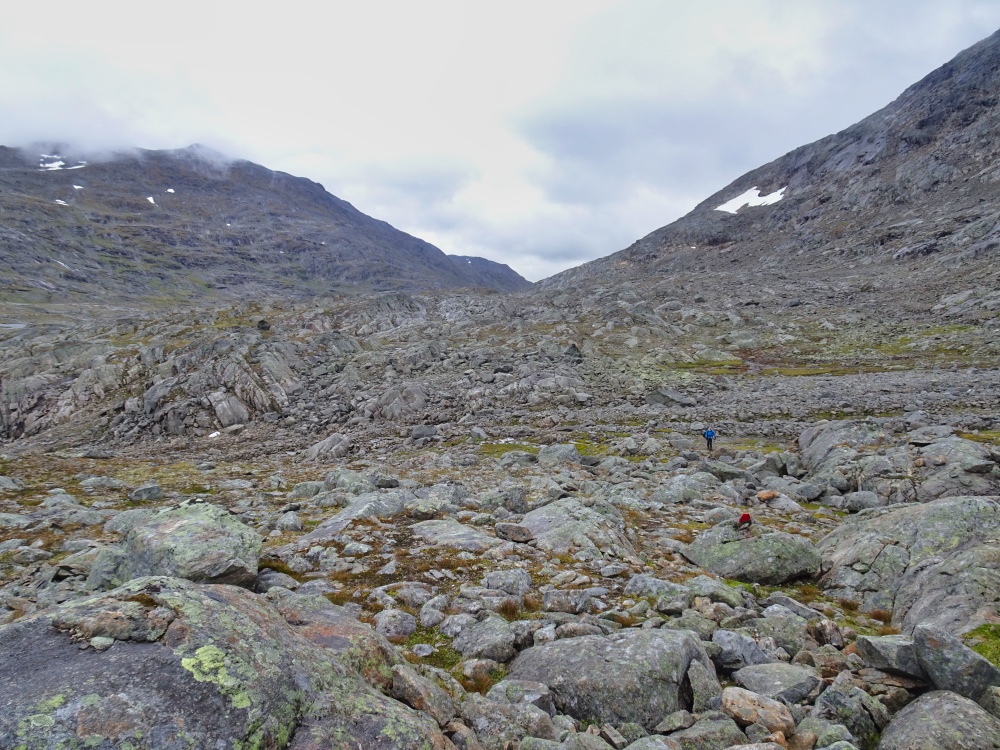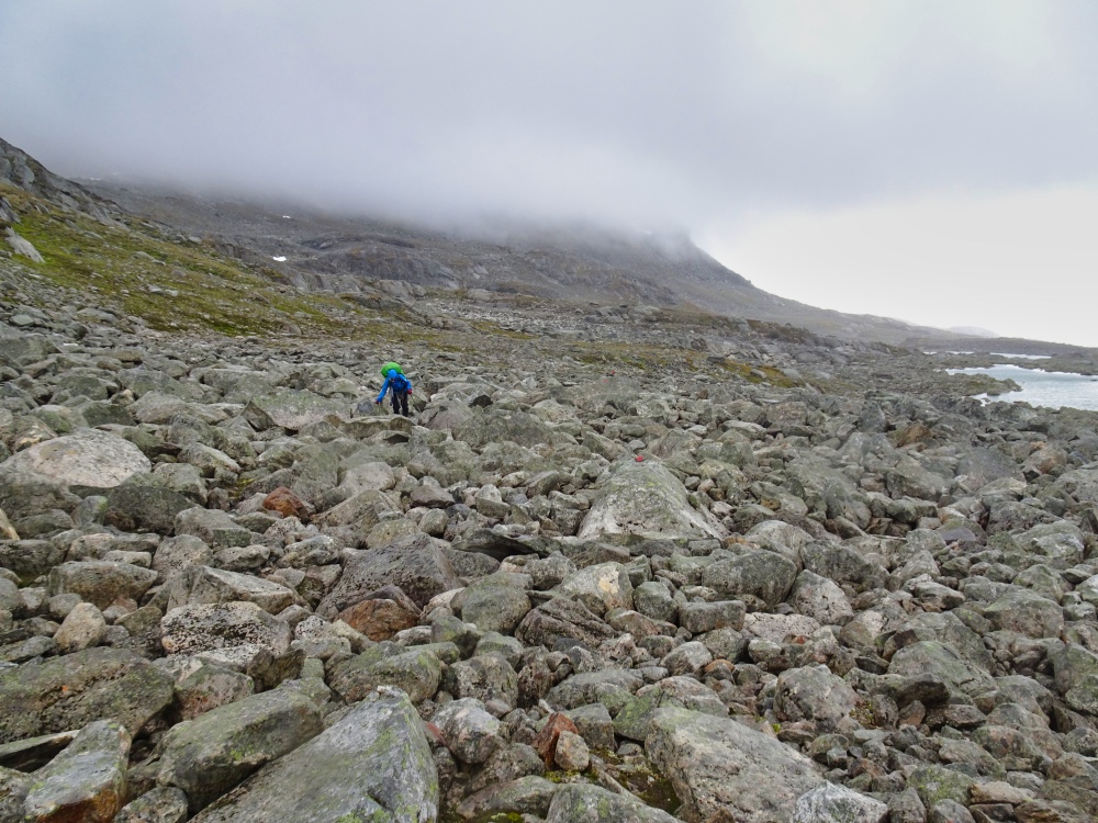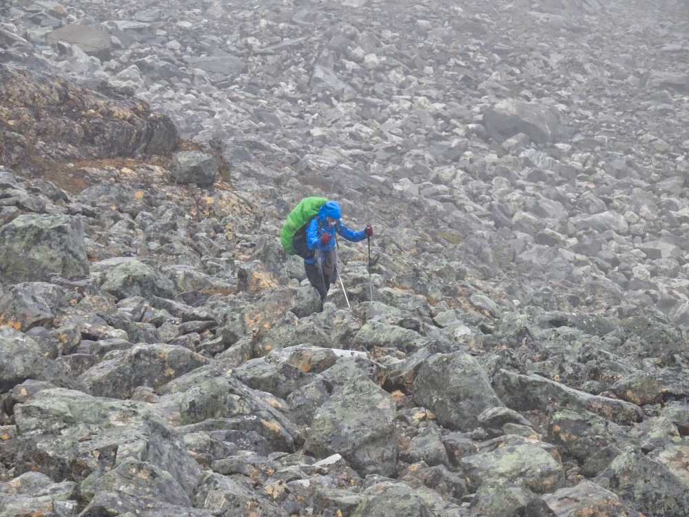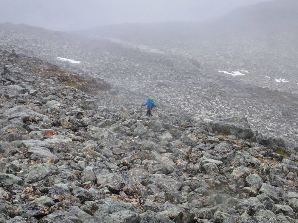 The next day we took off in rain and wind and started to climb up slowly towards the pass at about 1200 meters. Right from the get-go it was quite rocky. As we kept ascending towards the pass, the rain and wind increased in ferocity and the rocks became increasingly big and challenging. Soon it reached the level of silliness. For what seemed to be endless kilometers, the terrain changed into a huge field of boulders, each up to 2 or 3 meters big. They stretched as far as we could see in any direction. Progress became painfully slow as we spent hours and hours scrambling over the boulders. The driving rain and wind had made the boulders very slippery, which made jumping from boulder to boulder none the easier. Especially not with a foot injury. Due to the poor visibility it was sometimes challenging to locate the trail. We kinda lost track of time and just kept on ploughing through. After leaving the rockiest part behind us after what seemed like an eternity and rock-hopping across a final fast-flowing river, we finally arrived at Cáihnavággihytta, exhausted. What was supposed to be an easy 12 km turned out to be anything but.