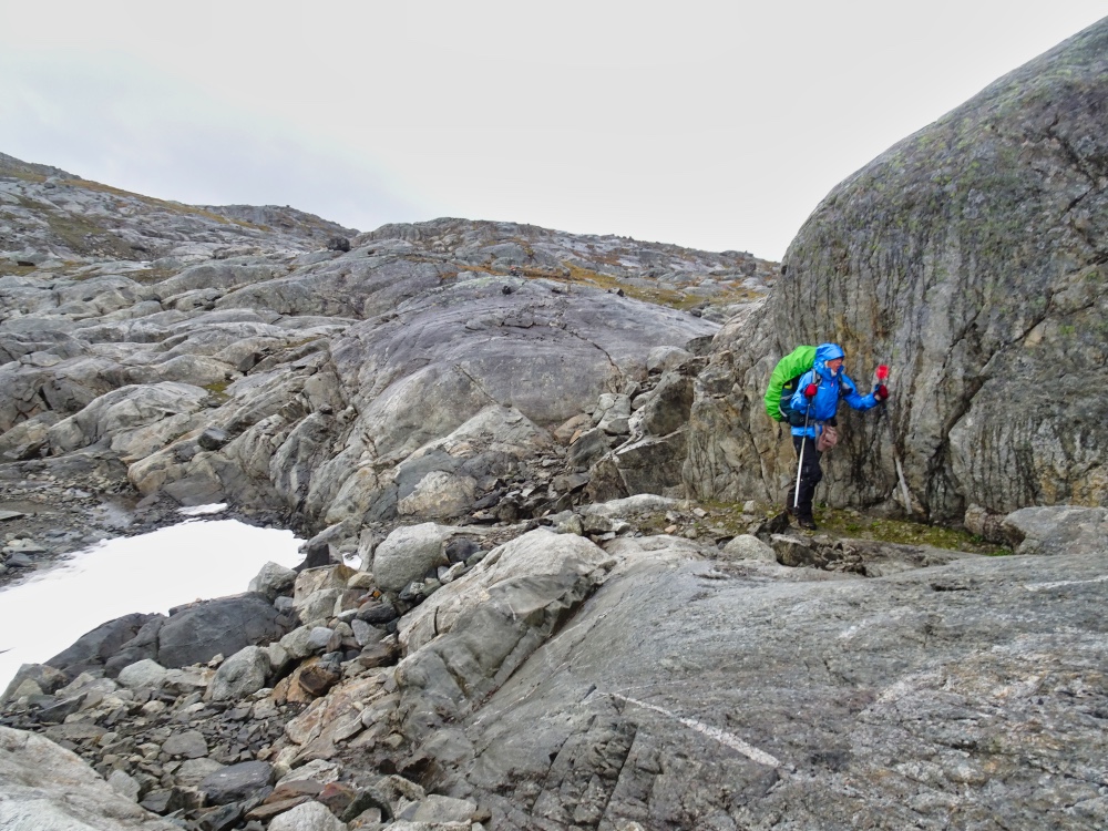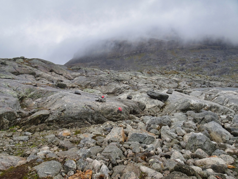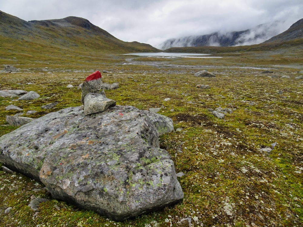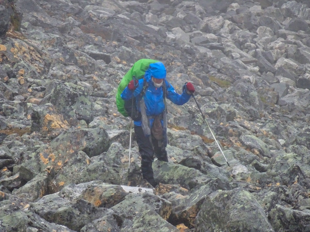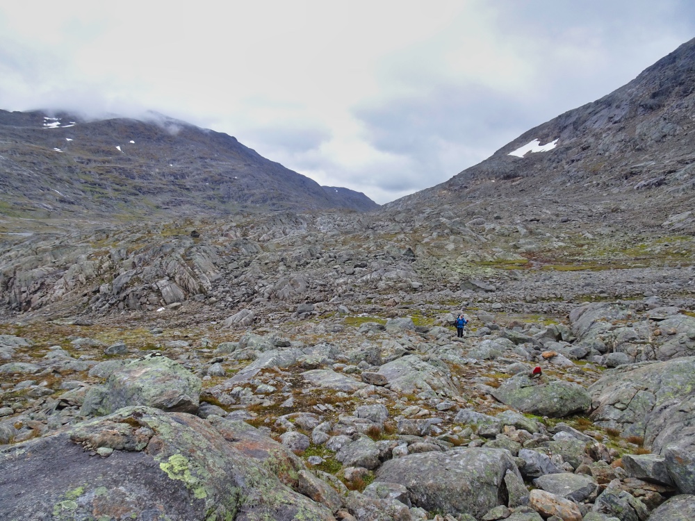 The next day we took off in rain and wind and started to climb up slowly towards the pass at about 1200 meters. Right from the get-go it was quite rocky. As we kept ascending towards the pass, the rain and wind increased in ferocity and the rocks became increasingly big and challenging. Soon it reached the level of silliness. For what seemed to be endless kilometers, the terrain changed into a huge field of boulders, each up to 2 or 3 meters big. They stretched as far as we could see in any direction. Progress became painfully slow as we spent hours and hours scrambling over the boulders. The driving rain and wind had made the boulders very slippery, which made jumping from boulder to boulder none the easier. Especially not with a foot injury. Due to the poor visibility it was sometimes challenging to locate the trail. We kinda lost track of time and just kept on ploughing through. After leaving the rockiest part behind us after what seemed like an eternity and rock-hopping across a final fast-flowing river, we finally arrived at Cáihnavággihytta, exhausted. What was supposed to be an easy 12 km turned out to be anything but.