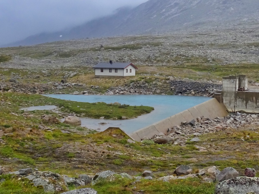 The day’s beginning was quite easy and straightforward. Down a lovely valley and which turned into another valley. Halfway we had lunch at the adorable Ollavaggihytta (we thought it was just an emergency shelter but it was actually a small two person hut). We continued on to the last bit, or so we thought. A few hundred meters past the hut we could choose between hiking straight to Katterat or first to the Hunddalshytta and then on to Katterat. We didn’t have the trail that goes straight to Katterat on any of our paper or electronic maps so we chose the route via Hunddalshytta. This route took us high over the mountains and was absolutely breathtaking. The weather was not the best but luckily we were used to that by now so we were in an excellent mood and enjoyed the beauty around us. Waterfalls, snowfields, rocky mountains that seem polished, and lots of little lakes. Suddenly we saw the dam. We quickly descended, crossed under the dam, and walked the final 1 km to the hut. Here we were welcomed by a sweet American couple who had already lit the fire and some candles.