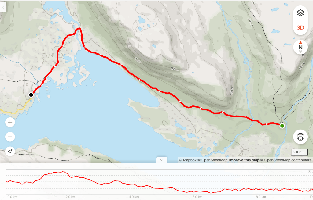 Distance 18.3 km, elevation gain 524 m (according to the map, there is also a trail closer to the river which may be better)