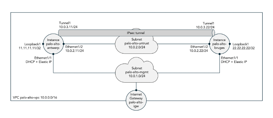 Figure 1: IPsec tunnel between two Palo Alto VM-Series firewalls running in AWS