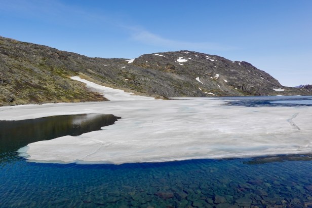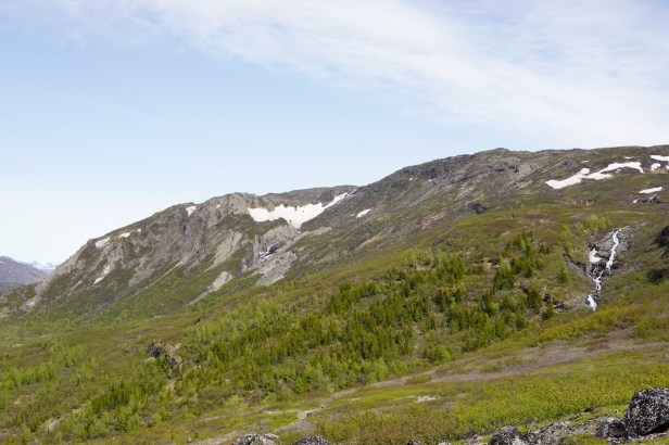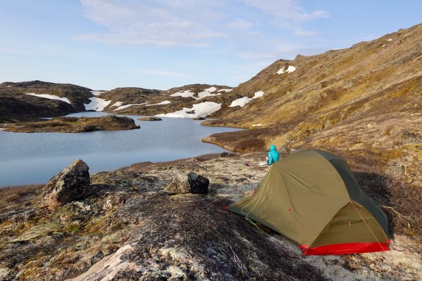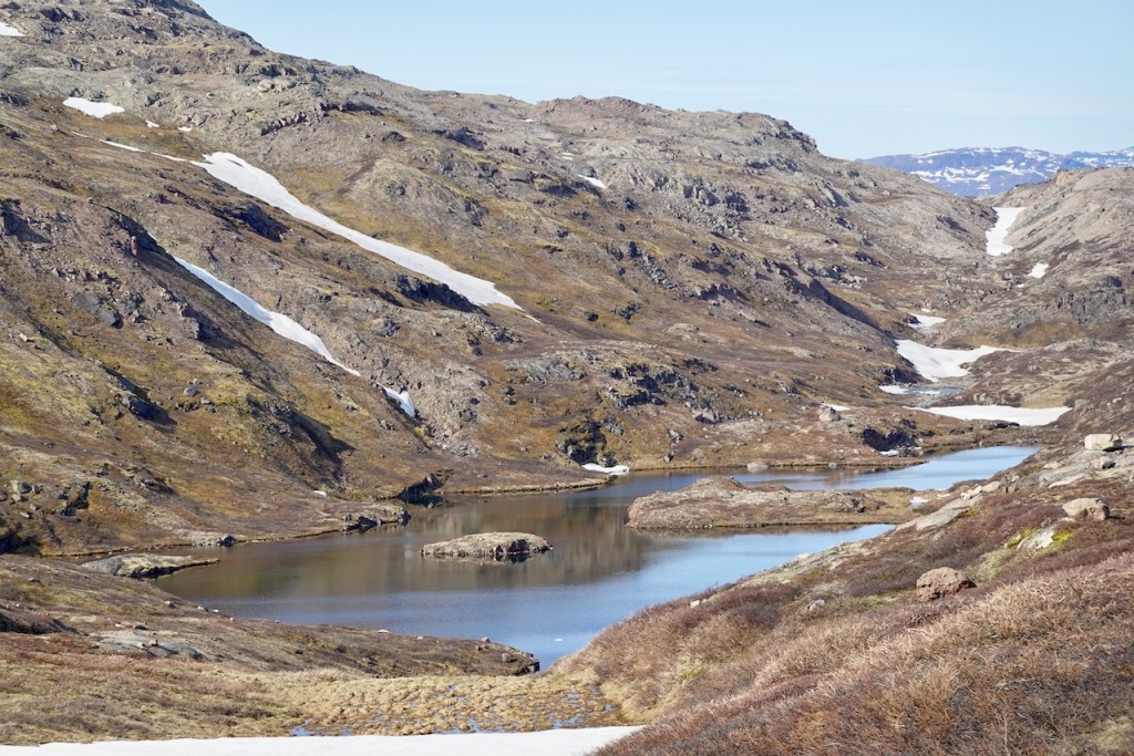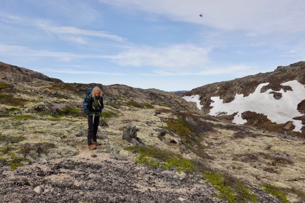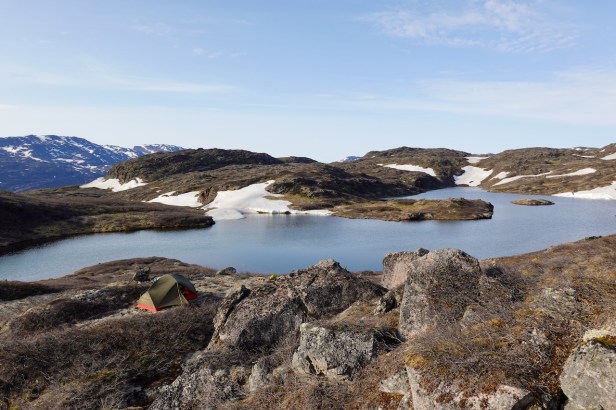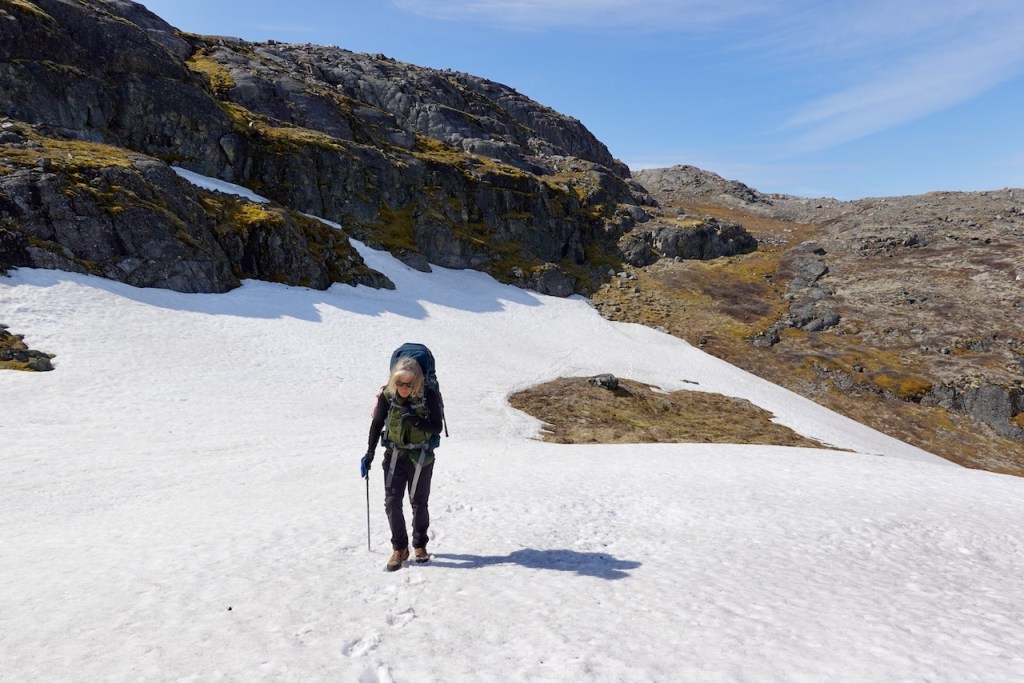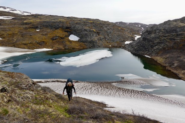 From the end of the well-defined trail, start heading North-East to follow the ridge for the rest of the day and the next day. There isn’t any trail to follow, but the necessary direction is sort of self-evident. Just stay at roughly the same altitude of around 450 meters, following the ridge line. There is a South-West to North-East gorge in the middle of the plateau filled with lakes and lingering snow patches (the source of an evidently hellish mosquito population later in June – there were none in May). Going North-East, you can follow the ridge on either the left side or the right side of this gorge. We went the left side, which is lower and seems easier.