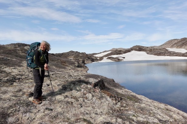 The landscape is rough, austere, and rocky. There are lots of small and large lakes. There is quite a bit of up and down and detouring around lakes and snow patches. But, in general, the hiking is not too difficult: there are no bogs or bushes.