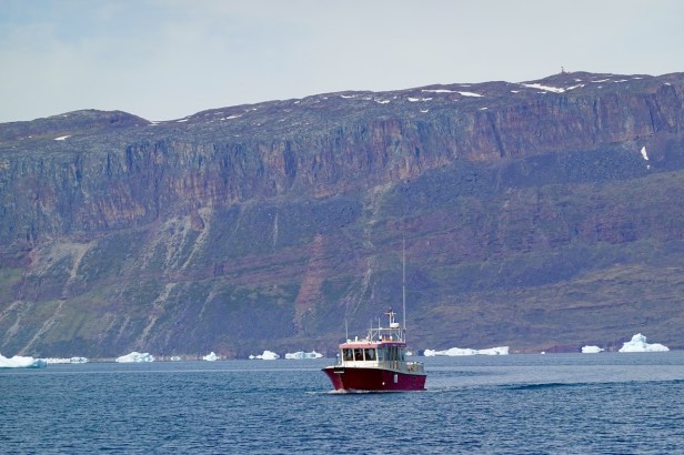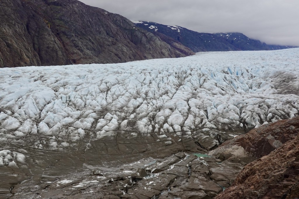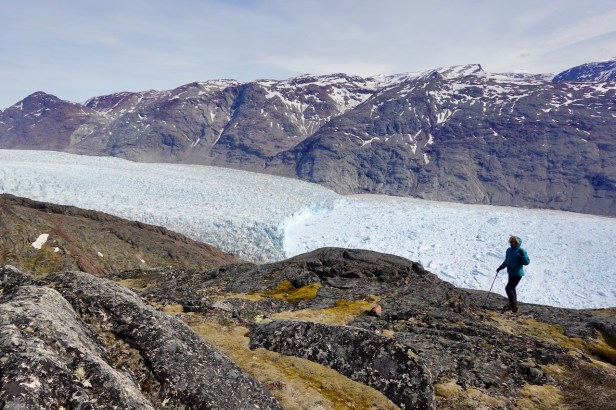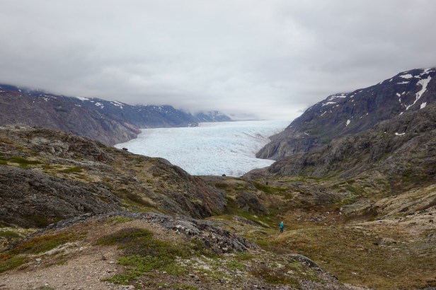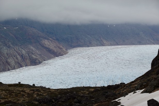 Once at the bottom of the valley, we made a brief detour, looping back to the right following the cliff, to reach a viewpoint looking at the face of the Kiattuut Sermiat glacier marked on the map. We did not really get a great view of the glacier – that would have required crossing the meltwater river which was impossible this time of year.