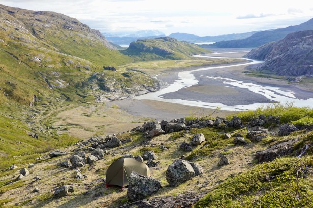 We could easily have made it back to Narsarsuaq that same day, but as we made our descent from the plateau towards the valley, we found one flat spot halfway down next to the river. We decided to pitch our tent here for one extra night to enjoy the last of the views.