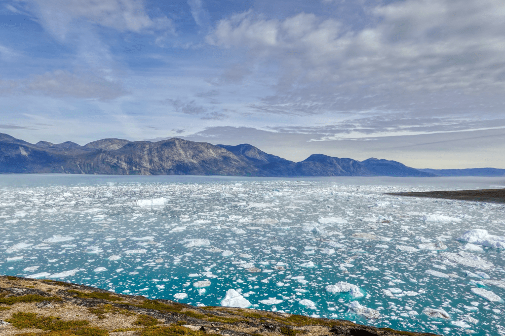 The trail veers inland, crosses some hills, and then traverses a big somewhat boggy grass plateau until you reach the ice fjord which is normally chock-full of small icebergs. Aim for the outcrop from where you will have a magnificent view.
