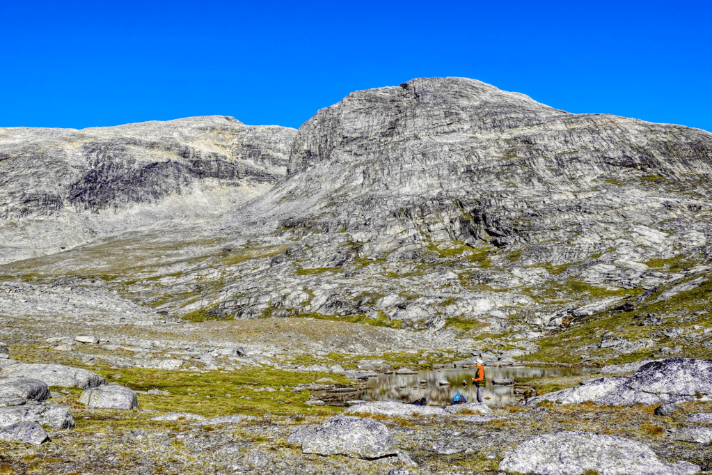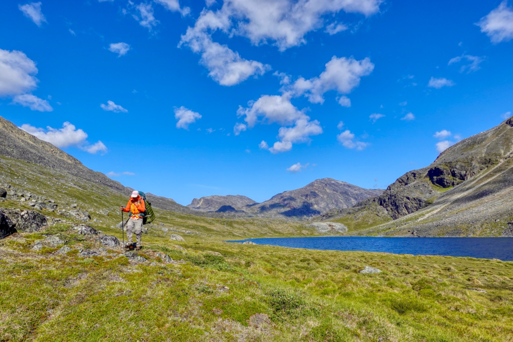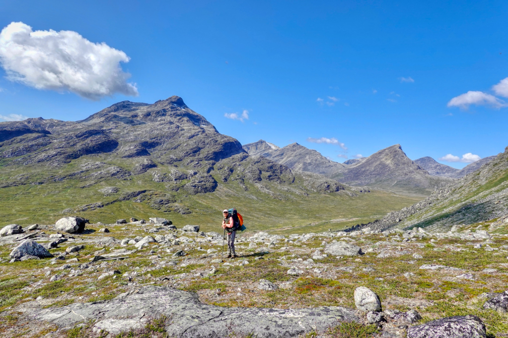 The day in front of us has a bit more up and down than the previous days but turns out to be pleasant hiking over relatively easy terrain without bushes, bogs, rocks, or other major obstacles, and fine mountain views all around.
