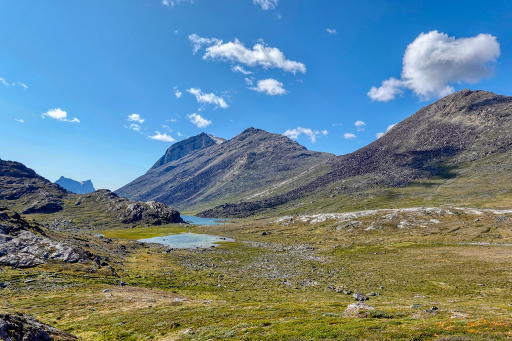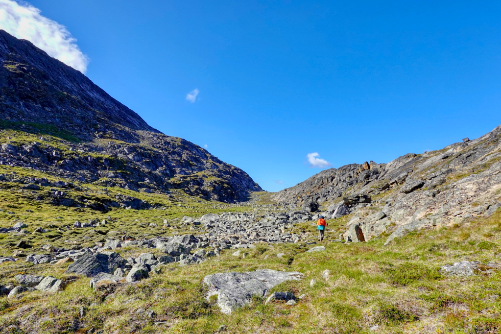 Whatever option you choose, you will eventually round the corner around a 1250 m high mountain (“Aqajamerngit Qulaat”) and find yourself going up north-west into the valley, parallel to a river, climbing to a scenic plateau at around 450 m.