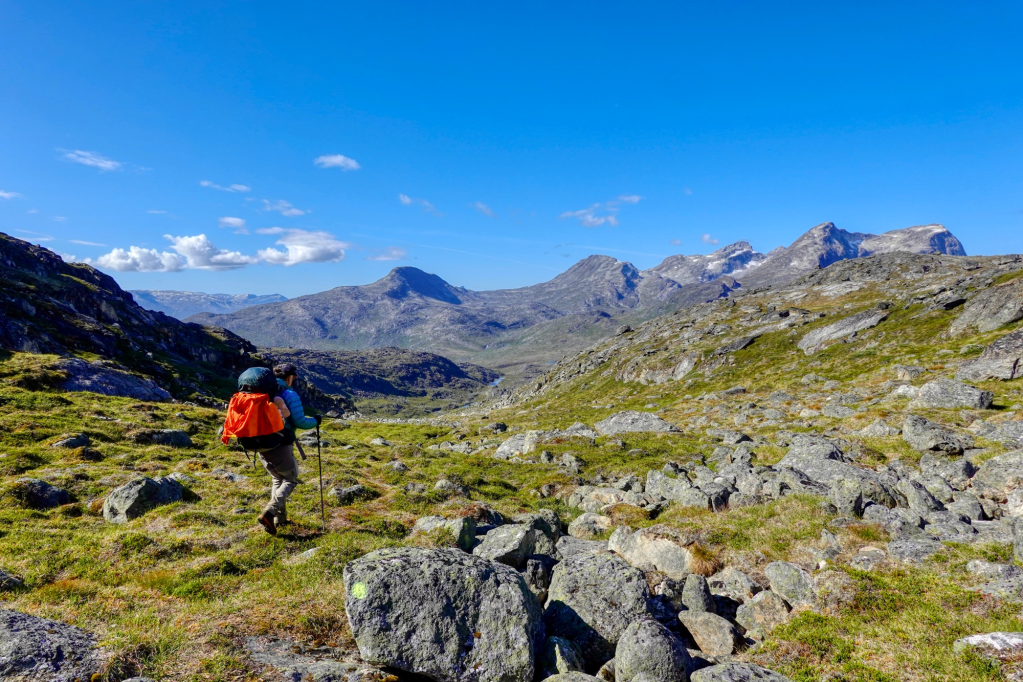 There are several ups and downs with vertical ascents or descents of between 400 and 700 meters. Many of these are very rocky and have no clear trail (but they do always have the new yellow dot markings). Some of them are quite steep. In particular on the second-to-last day on the Nuuk side, there is a steep 50+ meter high snow wall that persists the whole year and requires a good head for heights to ascend or descend (more about this in the detailed description).