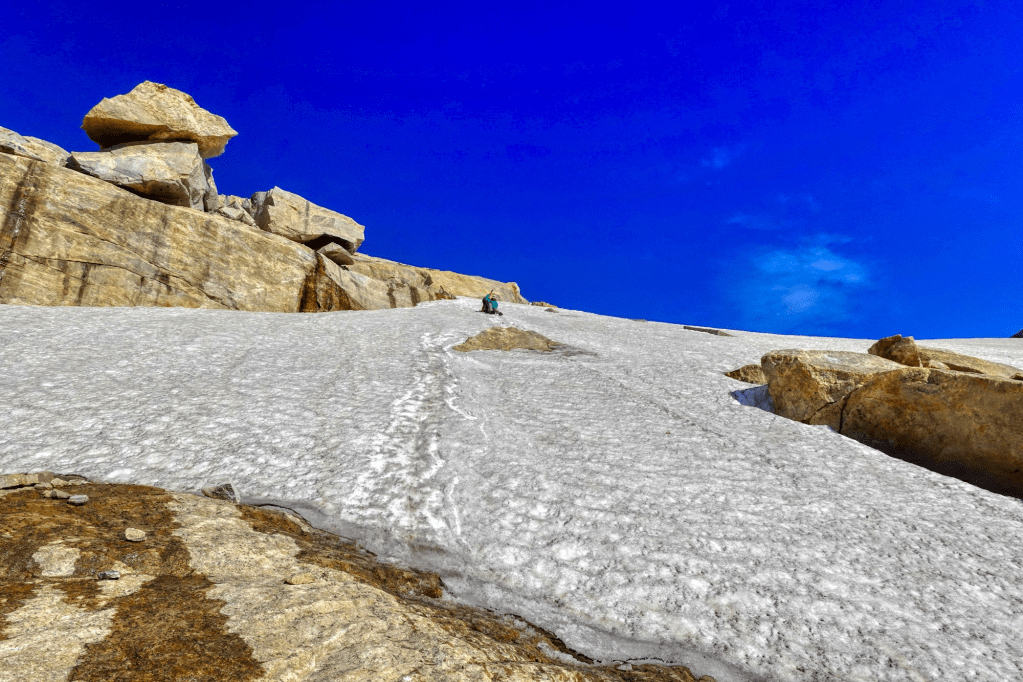 1) The most common option (best for folks going from Nuuk to Kapisillit, i.e., going up the snow wall) is to go to the far right of the valley (facing up), and simply walk up the snow, first sticking to the right and the slowly traversing over towards the left once you are almost at the top. After we had setup camp below the snow wall, we saw two other hikers do this (see photos below). And the tracks on the snow seemed to indicate other people had done it as well. This requires experience and confidence. You really have to kick your feet hard into the packed snow to get a good foothold. It seemed to me that spikes and poles would be very helpful, or even full crampons and an ice ax if you want to make it perfectly safe. If you lose your footing and slide down, it is steep enough to potentially cause seriously harm. But spikes, crampons, or an ice ax add a lot of weight, and you don’t need them anywhere else on the trek (at least not in early August; a June hike as described Rasmus’s blog is a different matter.)