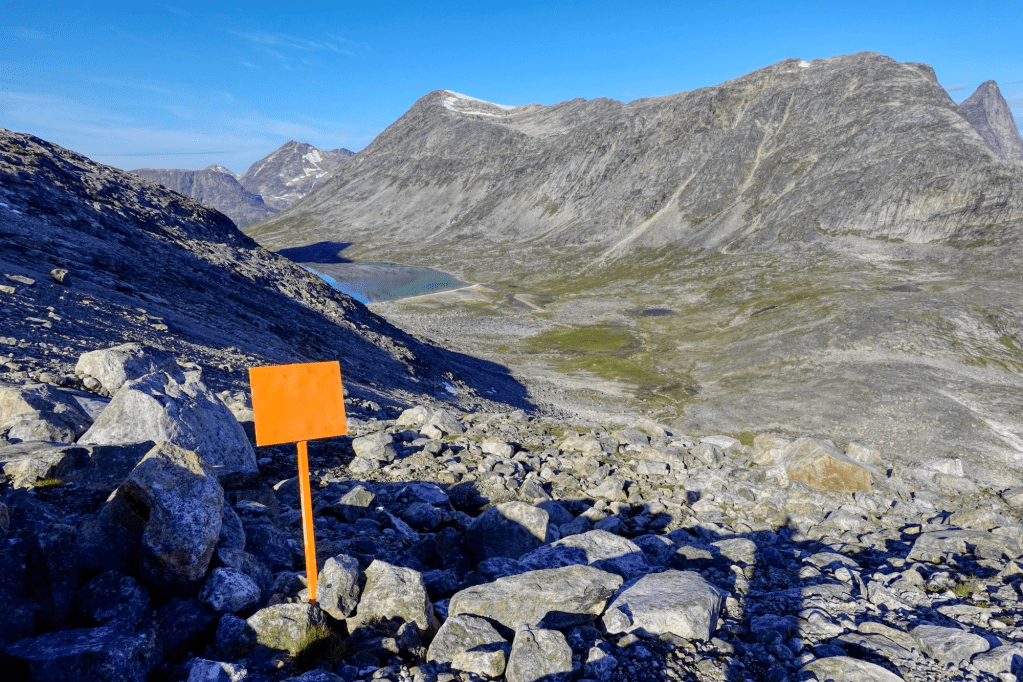 In the summer of 2024, Visit Nuuk in collaboration with Valdemar Wilhjelm Geisler did a project to mark the route for hikers. We did indeed find that the whole route was marked with bright yellow dots. They are not always clear, and they are easy to lose (it doesn’t help that they are a very similar color, size, and shape as the patches of moss that are present on many stones) but they are there, and they are an enormous help to follow the route. If you lose the dots (which we frequently did), the GPS tracks from the Visit Nuuk website follow the marked route exactly and can be used to find your way back to the marked route.