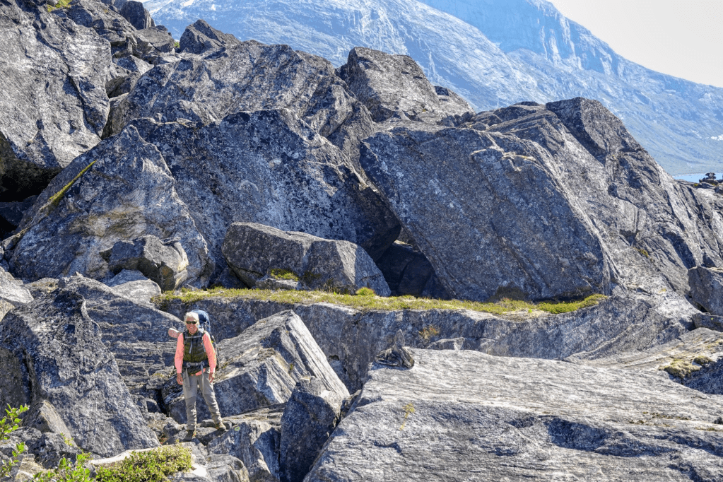 Once you reach the fjord, it’s another 8 km of boulder-hopping along the beach. This time the boulder hopping is quite a bit more difficult than what you did on day 1 on the Kapisillit side. The beach tends to be narrower, and the boulders tend to be larger and more difficult to cross.